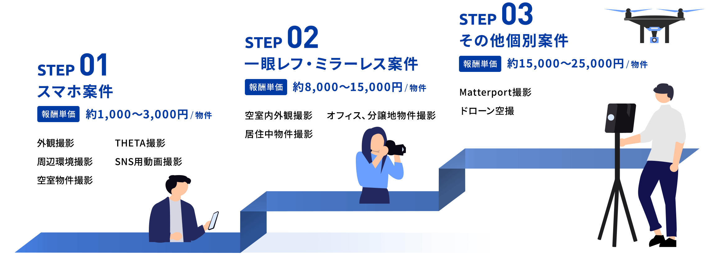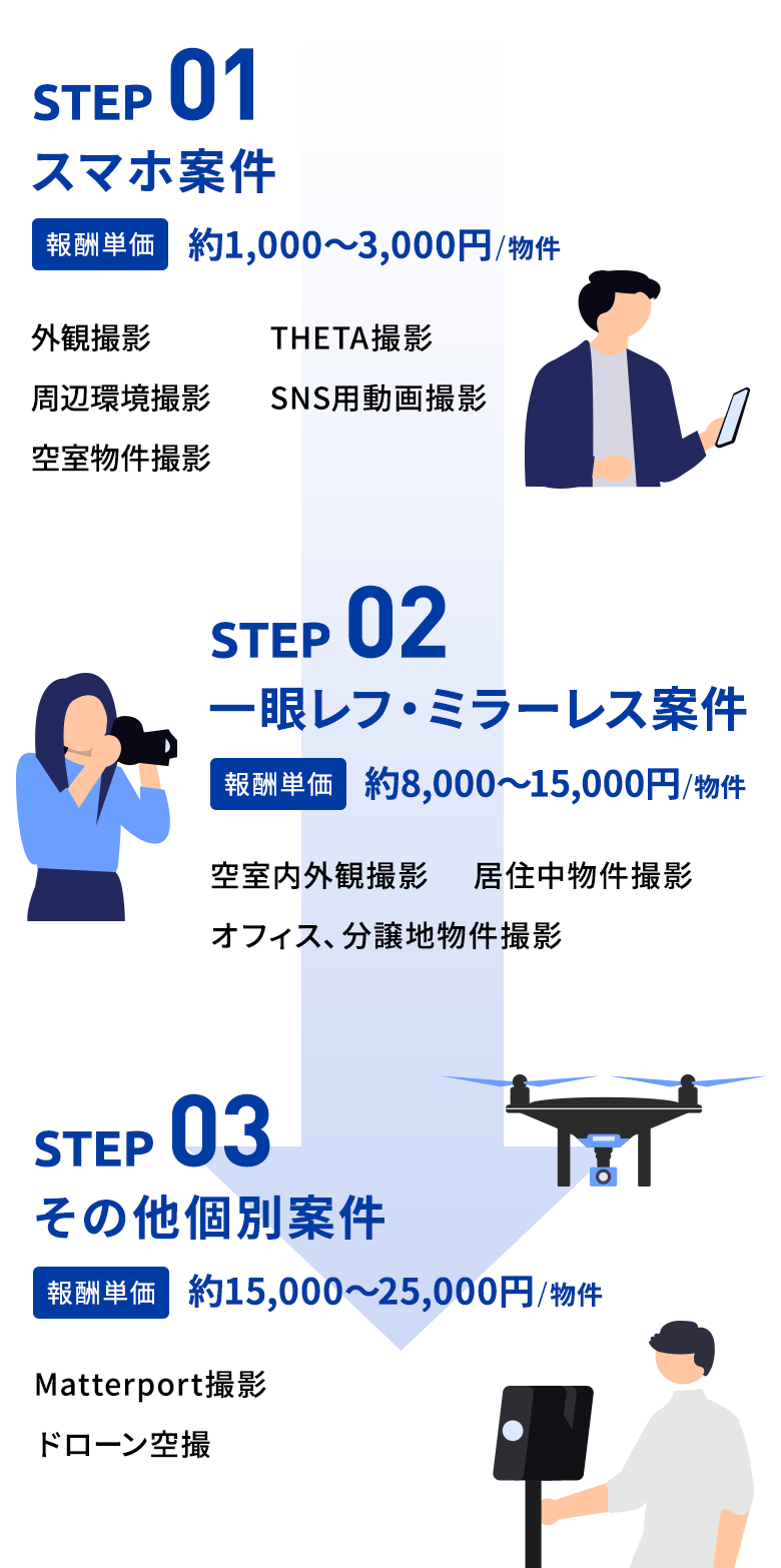 撮影初心者からプロカメラマンの方にまで、ステップごとに様々な撮影案件を募集しています。