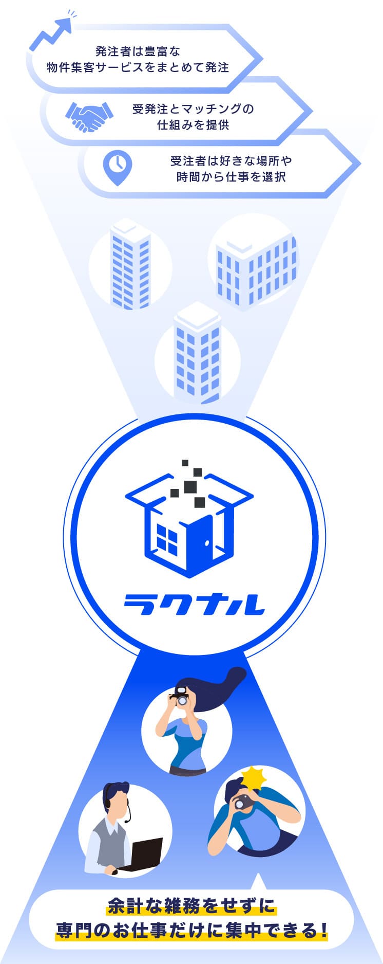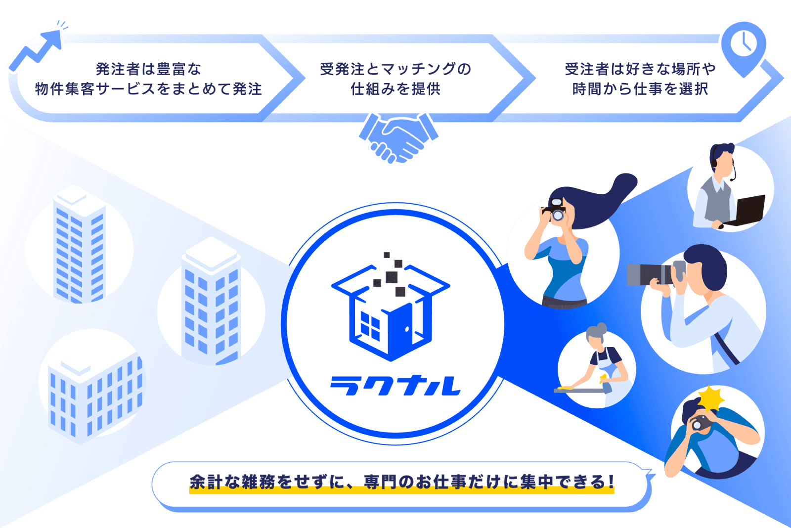 ラクナルは、不動産企業と様々な業務パートナーを繋ぎ、撮影をはじめとした不動産関連業務を「日本全国」で提供するマッチングプラットフォームです